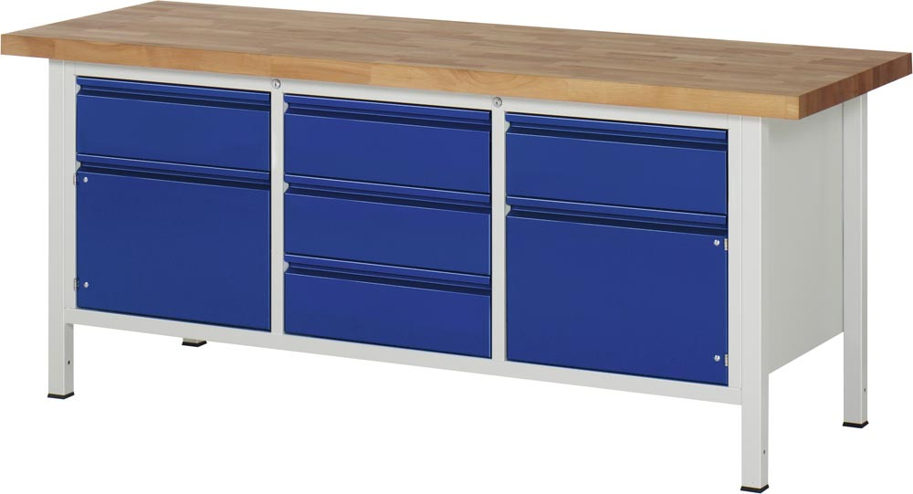 Werkbank, BxTxH 2000x700x840 mm, Platte Buche 40 mm, 5 Schubladen 180 mm, 2 Türen 360 mm, RAL 7035/5010 E1985330