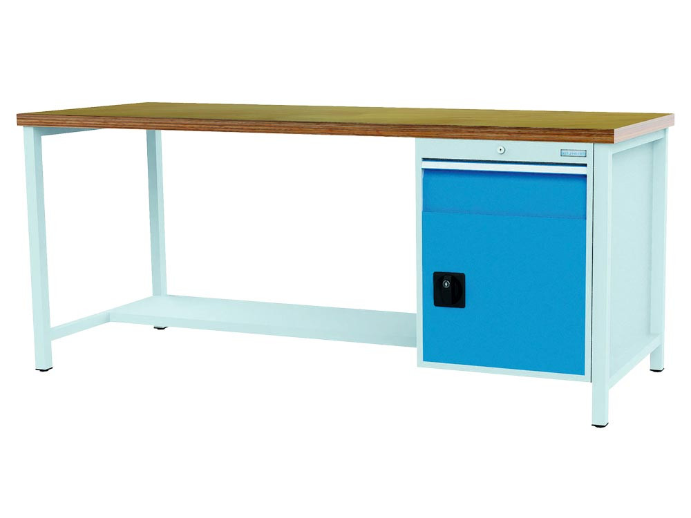 · Geschweißte Stahlblechkonstruktion · Arbeitsplatte Buche-Multiplex 40 mm · Tragkraft 1000 kg (bei gleichmäßig verteilter Last) · Gewicht 86 kg · 1 Stahlfachboden (1/2 Breite) · 1 Flügeltüre H 450 mm mit Zylinderschloß · 1 Schublade H 150 mm, 100% Vollauszug, Tragkraft 100 kg (bei gleichmäßig verteiter Last) · Hochwertige Pulverbeschichtung Rahmen: RAL 7035 Lichtgrau und Fronten RAL 5012 Lichtblau