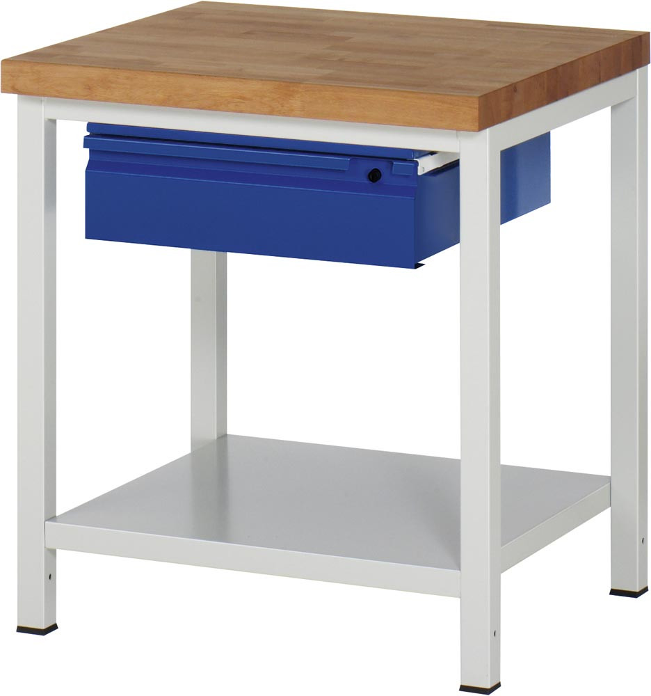 Werkbank, BxTxH 750x700x840 mm, Platte Buche 40 mm, inkl. Stahlblech-Ablageboden, 1x 150 mm Hängeschublade, RAL 7035/5010 E1978795
