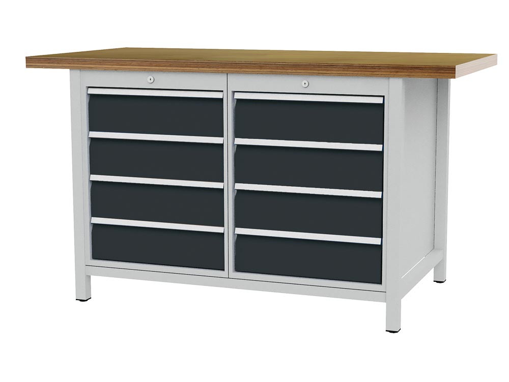 Werkbank, Platte Buche Multiplex 40 mm, BxTxH 1500x750x859 mm, 8 Schubladen: li 4x150 / re 4x150 mm, RAL 7035/7016 E6490375