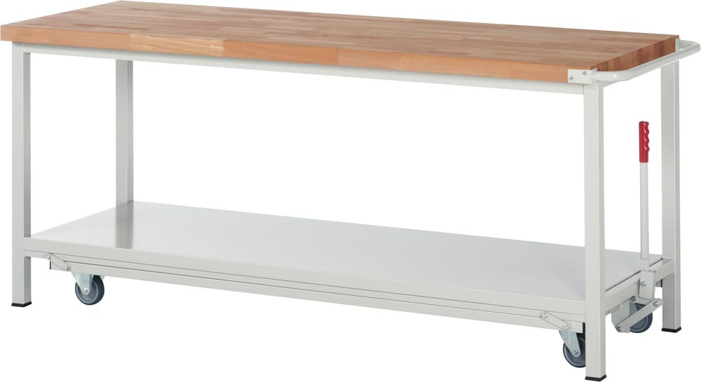 Werkbank mit absenkbarem Fahrgestell, BxTxH 2000x700x880 mm, Platte Buche 40 mm, RAL 7035, Ablageboden
