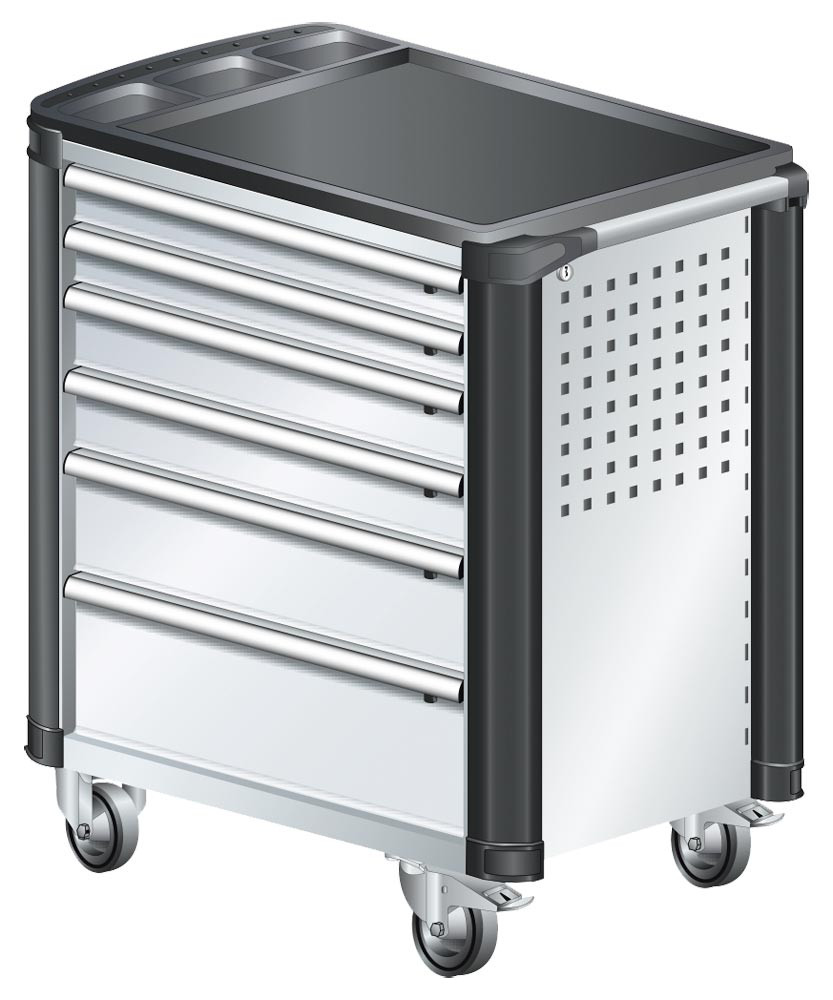 Werkstattwagen, 6 Schubladen: 2x75, 2x100, 1x150, 1x200 mm VA, BxTxH 894x525x928 mm, Kunststoffabdeckung, Kantenschutz, fahrbar, RAL 7035